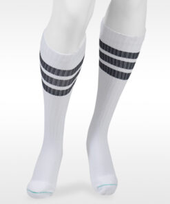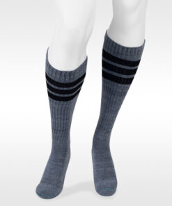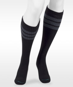 This super comfy 20-30 mmHg compression sock for men or women are the perfect fit with plenty of comfort. Juzo Power Comfort Socks are designed with a thick padded sole providing all-day cushioning for feet that work and play hard. Broad-ribbed for casual good looks, Power Comfort Socks deliver a therapeutic punch – the compression you need for healthy legs. Available in solid black or white and heather gray or white, black and heather with retro gray stripes.