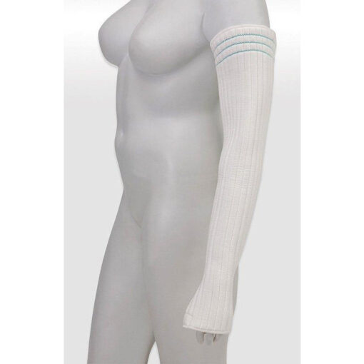 The Juzo SoftCompress Arm Liner is durable and soft. It runs from the armpit to wrist. It is designed to be worn under short stretch bandages, wraps and compression garments. Its vertically stitched foam channels effectively move fluid to promote lymph drainage and prevent soft tissue fibrosis. The product does leave visible markings when removed. The Arm Liner is machine washable and 100% cotton making it great for sensitive skin. If you have an open wound in the area, it must be covered in a suitable dressing before applying the liner. The product can be cut to the appropriate length by following the free stitching/cutting marks.