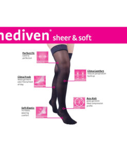 The Mediven Sheer & Soft are the sheerest medical compression stockings on the market. They are preferred four to one by compression stocking wearers. In addition to being the sheerest, independent studies found them softer and more durable. Unlike many sheer stockings, these stockings do not utilize silicone on their yarns permitting added breathability and improved moisture regulation making them cooler and dryer than the leading competition.