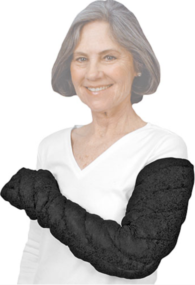 Chevron channels in this Tribute provide bi-directional gradient flow, medial to lateral (from side to side) and distal to proximal (from fingertips to shoulder cap.) Fully covers the fingers, arm, and shoulder cap. Provides 28-30mmHg at distal end, and 18-20mmHg at proximal end.